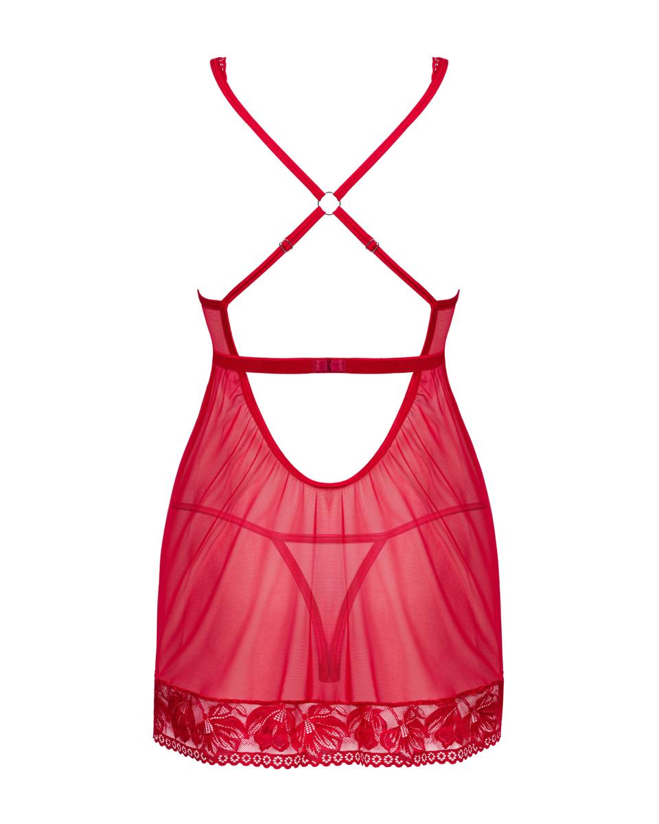 Questo affascinante set di lingerie di colore rosso intenso ti ruberà il cuore. Il babydoll presenta pizzo e tessuto traslucido, e il perizoma esalta il derrière, creando un'invito ideale per un appuntamento romantico. Senti la scintilla? Prepara un'esperienza indimenticabile con il set Lacelove.