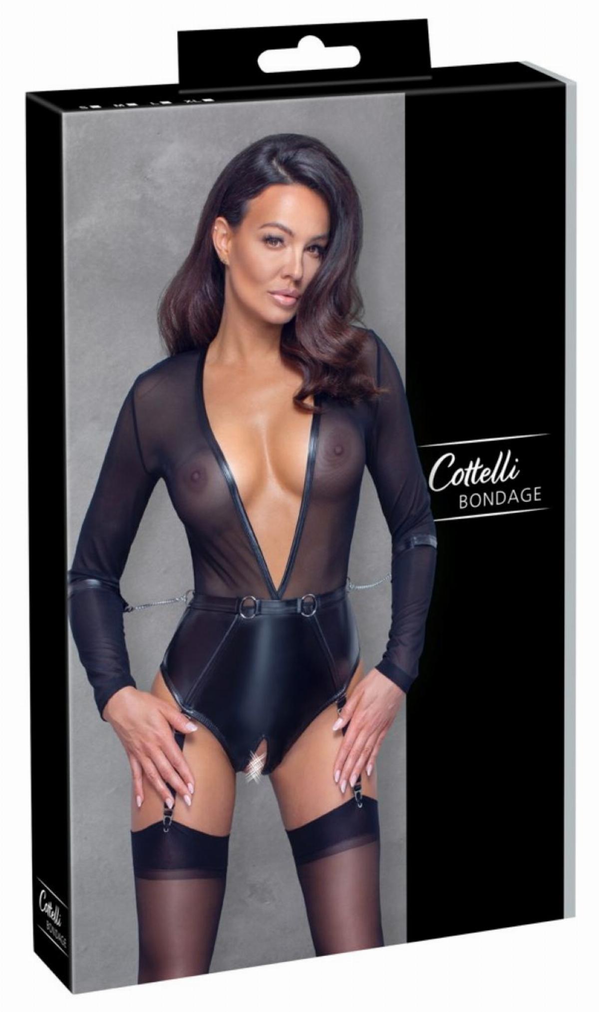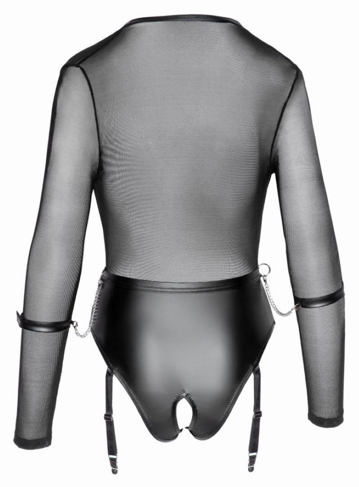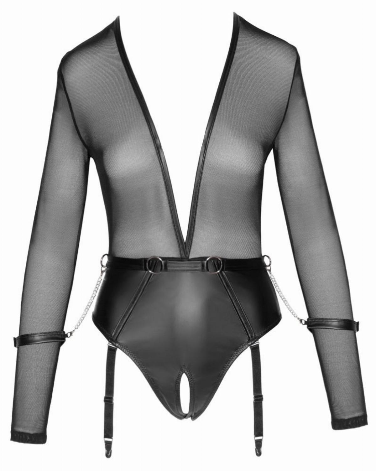 Sicuramente attirerai l'attenzione in questo body con reggicalze rock! Questo body extra a taglio basso con materiale trasparente in finitura opaca è una fantasia che diventa realtà. Il body ha reggicalze, manette incorporate e un cavallo aperto per un look audace. Le reggicalze sono regolabili e removibili.