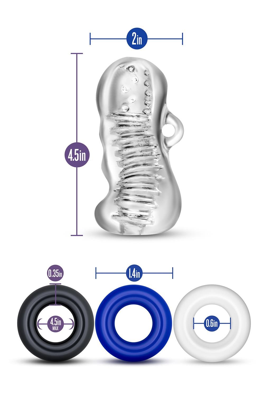 Steigern Sie Ihr Vergnügen mit dem Quickie Kit - Jerk Off. Verwenden Sie die drei Cockringe für zusätzlichen Druck und verbesserte Ausdauer, während Sie sich mit der weichen, gerippten Hülle verwöhnen. Die texturierte Innenkammer bietet intensive Empfindungen bei Solo-Abenteuern und ist perfekt für spielerische Momente mit einem Partner.