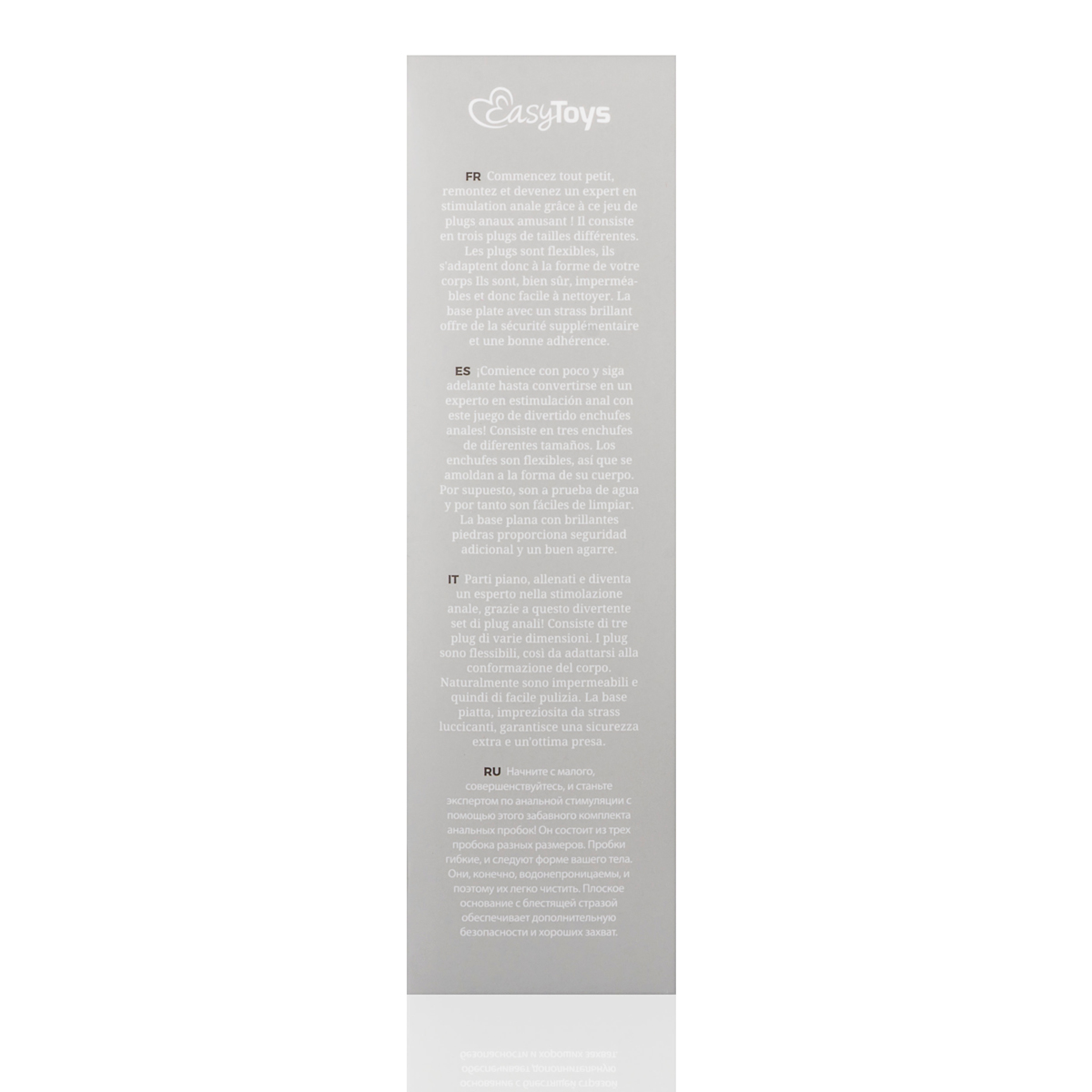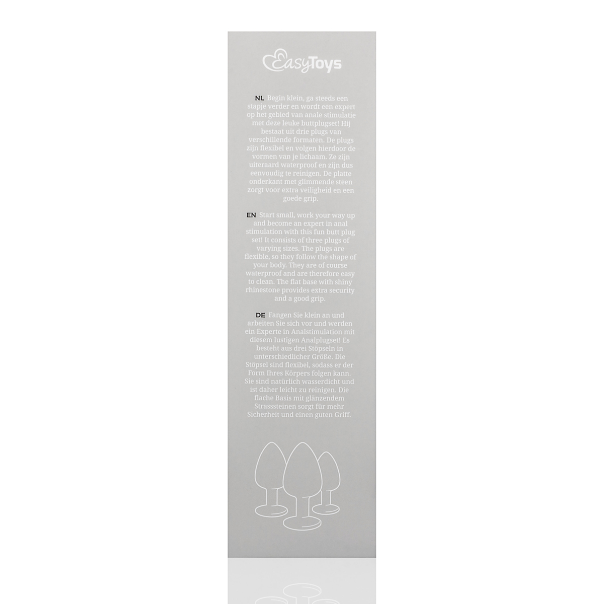 Questo set di tappi a 3 butt plug è perfetto per chiunque desideri scoprire la stimolazione anale. I butt plug hanno diverse dimensioni, quindi puoi iniziare dal più piccolo per poi aumentare progressivamente la dimensione. I plug sono realizzati in silicone davvero morbido e sicuro per il corpo e l'uso è confortevole. Il fondo piatto dei plug garantisce un utilizzo sicuro. La base presenta anche una bella pietra, che conferisce ai plug un aspetto lussuoso.
